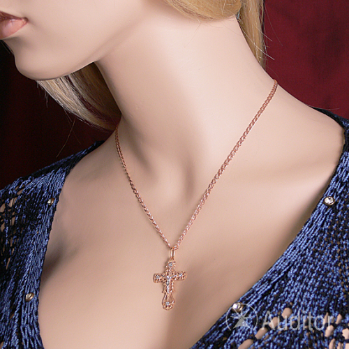 Привезак крст од 585 злата, израђен у комбинацији црвеног и белог злата. Сам крст је направљен од топлог црвеног злата, док је Христов лик израђен од белог злата 585 и издваја се у контрасту са позадином.<бр />