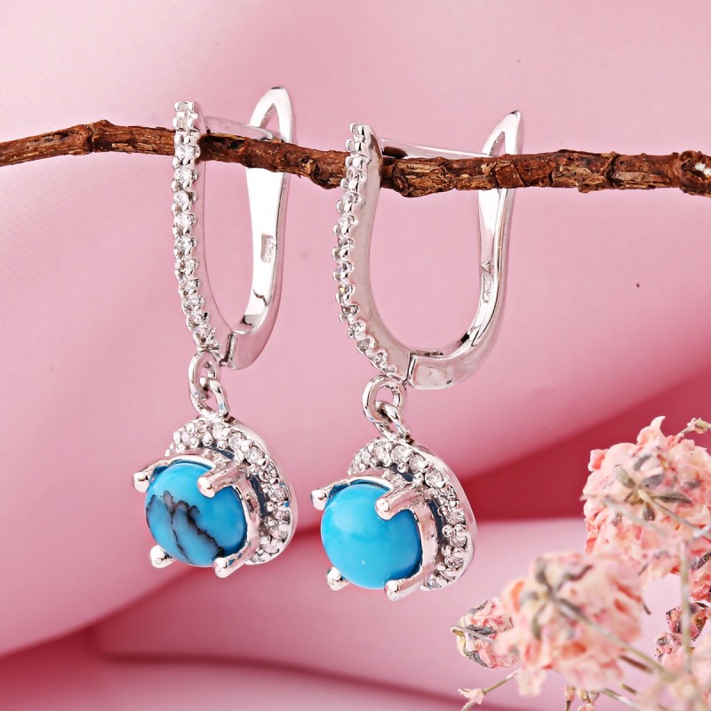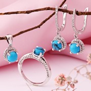 Сет направљен од 925 сребрних тиркиза и цирконија. Елегантан сет у модерном стилу направљен од 925 сребра са тиркизном и цирконијом наглашава њен стил и индивидуалност. Сет се састоји од приколице, прстена и минђушама. <Бр />
