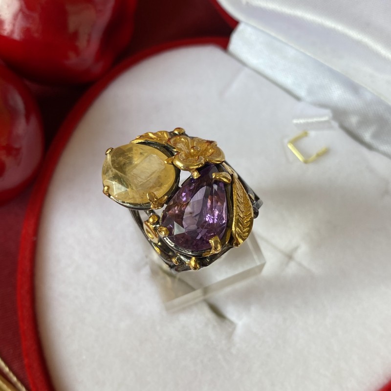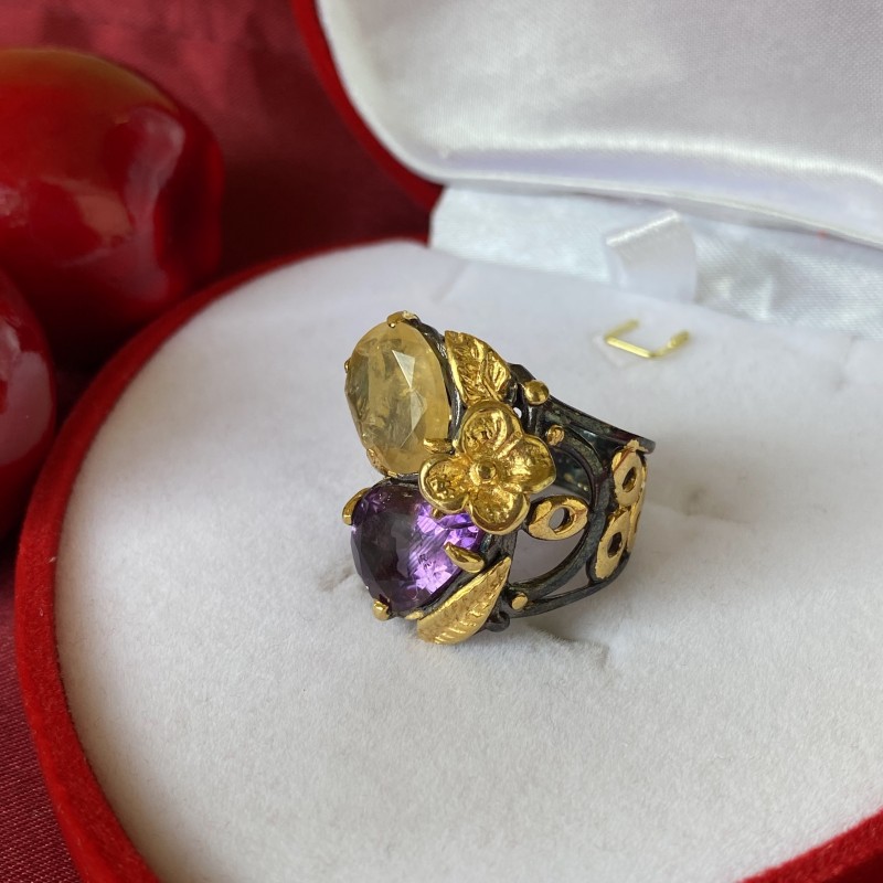 аметистом и кварцом. Захваљујући вешто постављеним акцентима помоћу позлаћења, прстен изгледа јединствено лепо. Одличан додатак вашем имиџу женствености и романтике.<бр />