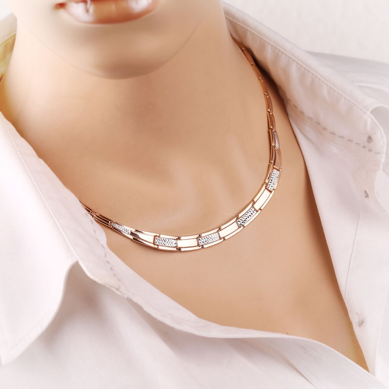 Златни оклоп од црвеног злата / белог злата 585 °. Грациозна и обимна златна цоллиер направљена од 585 белог злата и црвеног злата са блиставим дијамантским пресеком. Унутрашњост огрлице је глатка са површином огледала. Цоллиер направљен од злата поставио је неопходни нагласак на слици и скренути пажњу на богатство и луксуз додатака, јер је злато прелепо, стилски, шик и скупо. Одговара и солидној дами и младој жени. <бр />