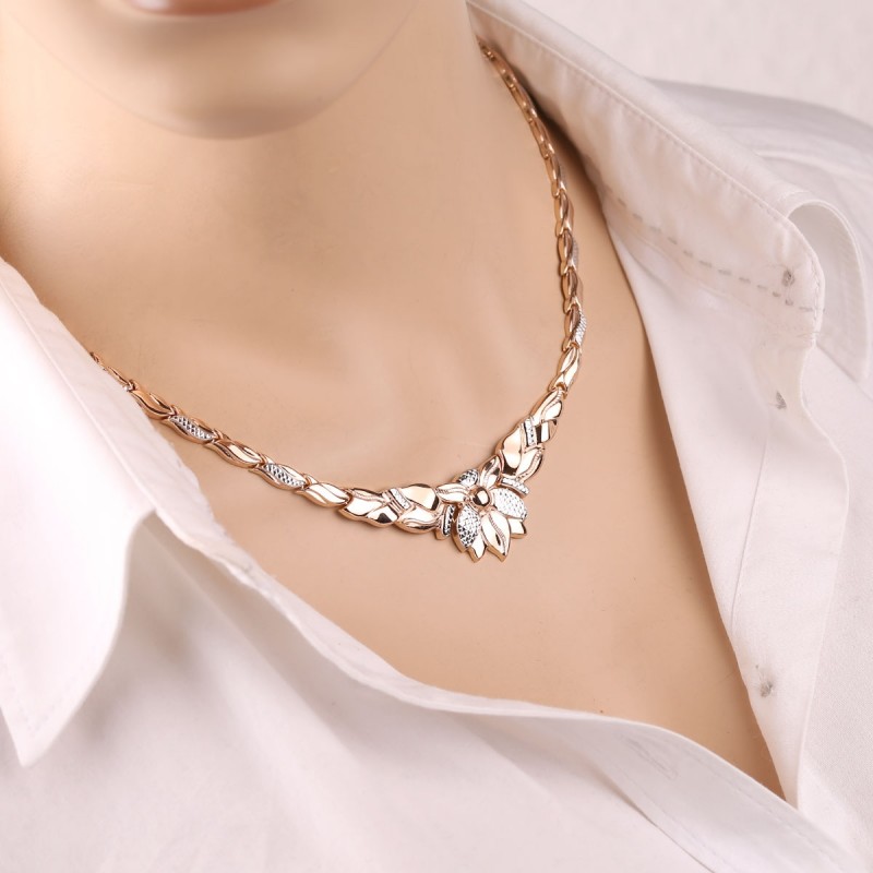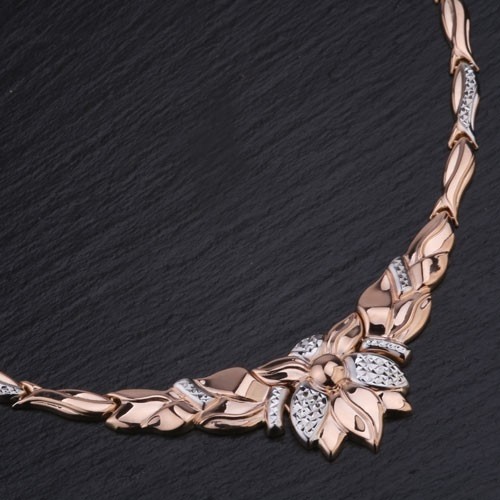 Златни оклоп од црвеног злата / белог злата 585 °. Грациозна и обимна златна цоллиер направљена од 585 белог злата и црвеног злата са блиставим дијамантским пресеком. Унутрашњост огрлице је глатка са површином огледала. Цоллиер направљен од злата поставио је неопходни нагласак на слици и скренути пажњу на богатство и луксуз додатака, јер је злато прелепо, стилски, шик и скупо. Одговара и солидној дами и младој жени. <бр />
