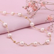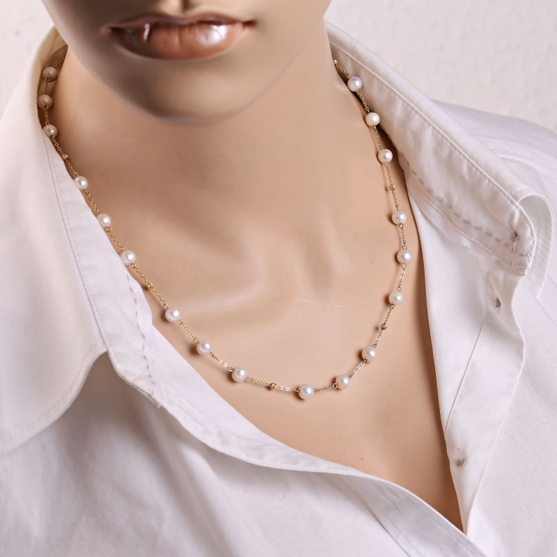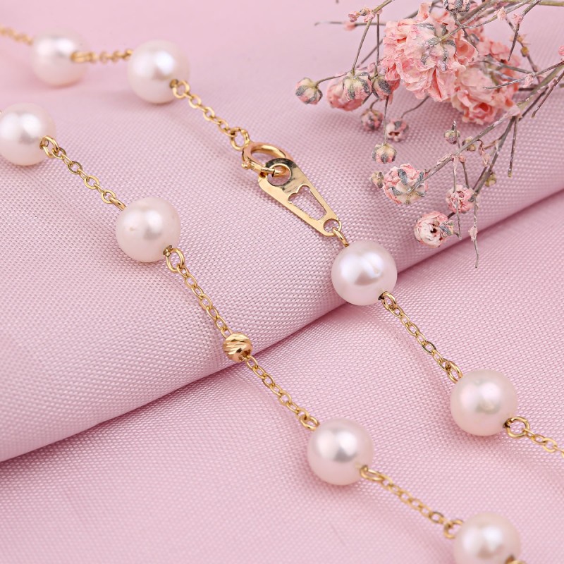 Златна огрлица жуто злато Руско злато 585 перли. Елегантна златна огрлица од 585 жутог злата са уметцима очаравајућих култивисаних бисера, на дијамантском сидреном ланчићу од 585 жутог злата, украшена златним куглицама брушеним дијамантима.<бр />