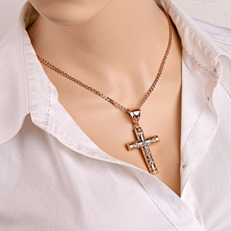 Прекрштени привезак са 585 златног ланца. Велики крст у олакшању израђен је од 585 црвеног злата и украшен је 585 белим златним телом и натписом Инри. <Бр />