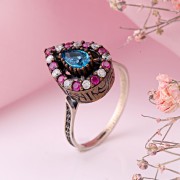 Сребрни прстен 925 у отоманском стилу! Овај прстен је експресивна композиција у отоманском стилу у којој боја и структура заузимају централно место.<бр /> <бр /> У центру сија плави швајцарски топаз у облику сузе. Његова бистра плава чини интензиван контраст са поцрњелим и бронзаним сребром и даје дизајну дубину и живост.<бр /> <бр /> Око средишњег камена је 9 рубин корунда и 9 цирконија. Они чине шарени оквир и наглашавају оријентално инспирисан дизајн. Орнаментисана прстенаста трака са стране употпуњује целокупну уметничку слику.<бр /> <бр /> Упркос својим компактним димензијама, прстен делује присутно и пун карактера. Идеалан као појединачни комад или у комбинацији са одговарајућим минђушама ⇒ <а хреф="хттпс://ввв.аудитор585.де/схоп/схов-продуцт/585043889/472/силберохрринге-ориенталисцх-кауфен/?ланг=де"><стронг>СО17155><бр / <бр /> <у><стронг>Технички детаљи:<бр /> <бр /> • Дужина главе прстена: 14,0 мм<бр /> • Ширина: 11,0 мм<бр /> • Висина: 9,0 мм<бр /> • Прстенаста трака: ширина 1,7 мм, дебљина 0,9 мм<бр /> <бр /> • Централни камен: 1 плави швајцарски топаз, 6,0 × 4,0 мм (у облику сузе)<бр /> • Трим:<бр />  – 9 цирконија Ø 1,7 мм<бр />  – 9 рубин корунда Ø 1,7 мм<бр /> <бр /> • Материјал: сребро 925<бр /> • Површина: поцрнела и бронзана<бр /> • Стил: Османски<бр /> <бр /> Шарени комад накита са декоративном дубином и снажним дизајном карактера.<бр /> <бр /> <стронг>Упутства за негу:<бр /> Да бисте одржали лепоту прстена, избегавајте контакт са хемикалијама, детерџентима и козметиком (парфем, ацетон, итд.).<бр /> <бр /> <стронг>Напомена о димензијама:<бр /> Мања одступања од информација о сертификату не утичу на изглед или вредност комада накита.<бр /> <бр /> <стронг>Куповина без ризика:<бр /> Поврат или замена могућа у року од 14 дана. Трошкове слања сноси купац.<бр /> (Детаљи у нашим Општим условима и одредбама)<бр типе="_моз" />