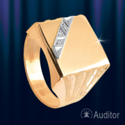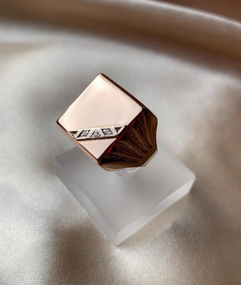 Herrring - signetring, gjord av ryskt rött guld 585°, kombinerat med vitguld, dekorerad med cubic zirkonium. Ringen har en högpolerad utsida. På ringens inre slutna yta finns en stämpel med guldprovet.