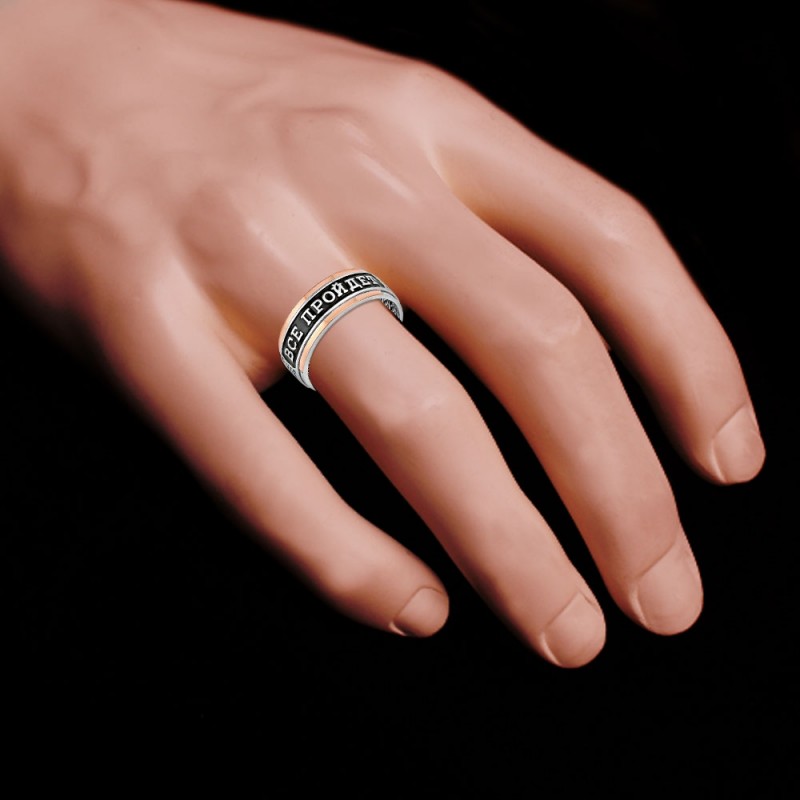 Ring gjord av svärtat 925 sterling silver med 375 guld i en ovanlig design med tekniken att svärta silver med en rysk reliefinskription "Allt kommer att bli bra."