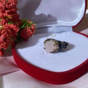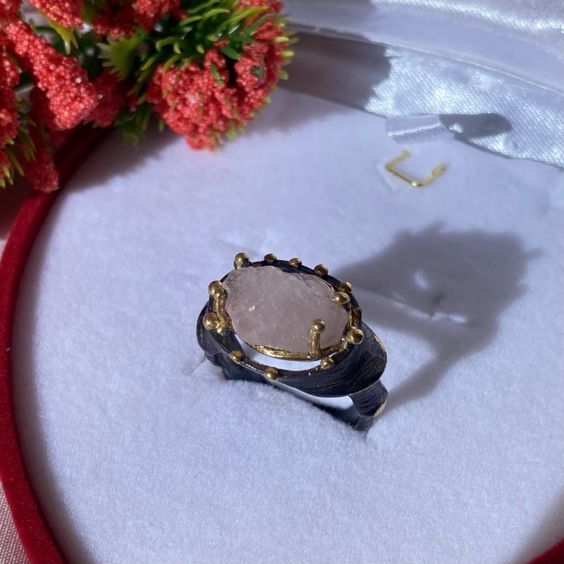 En charmig ring gjord av svärtat 925 silver med solid gul guldplätering, dekorerad med vacker naturlig obearbetad rosa kvarts. Tack vare skickligt placerade accenter med guldplätering ser ringen unikt vacker ut. Ett utmärkt komplement till din bild av femininitet och romantik.