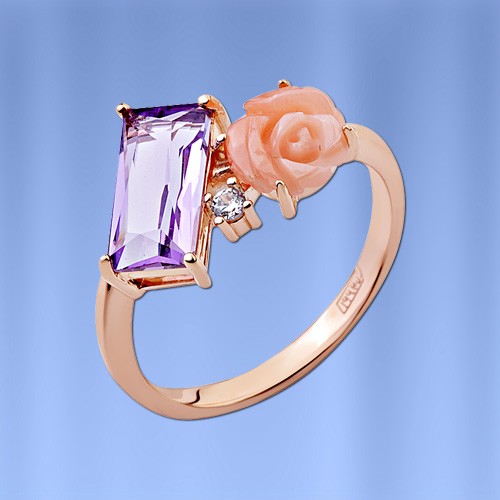 En ring gjord av ryskt rött guld 585° med korall ¢ 6,0 mm 0,169, Ametist 10,0 x 5,0 mm 0,302, Fianit ¢ 2,0 mm 0,012