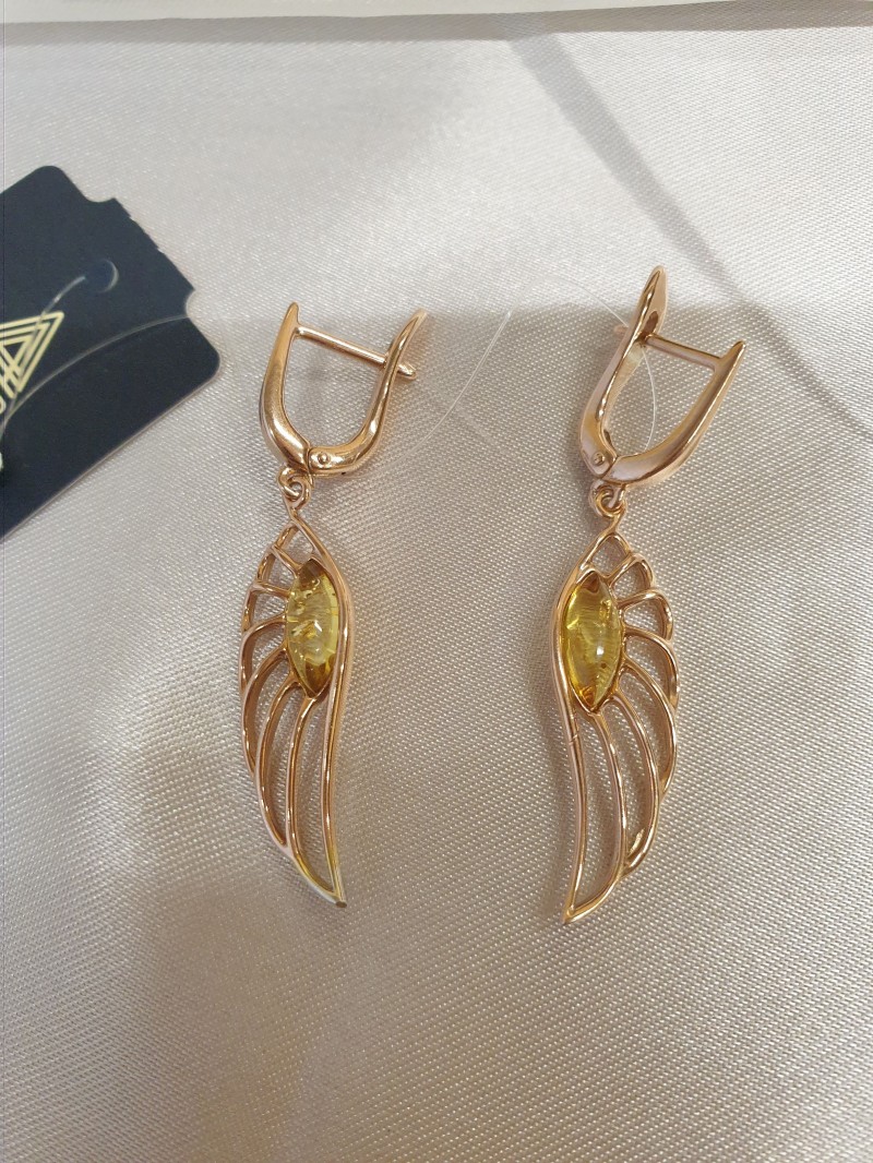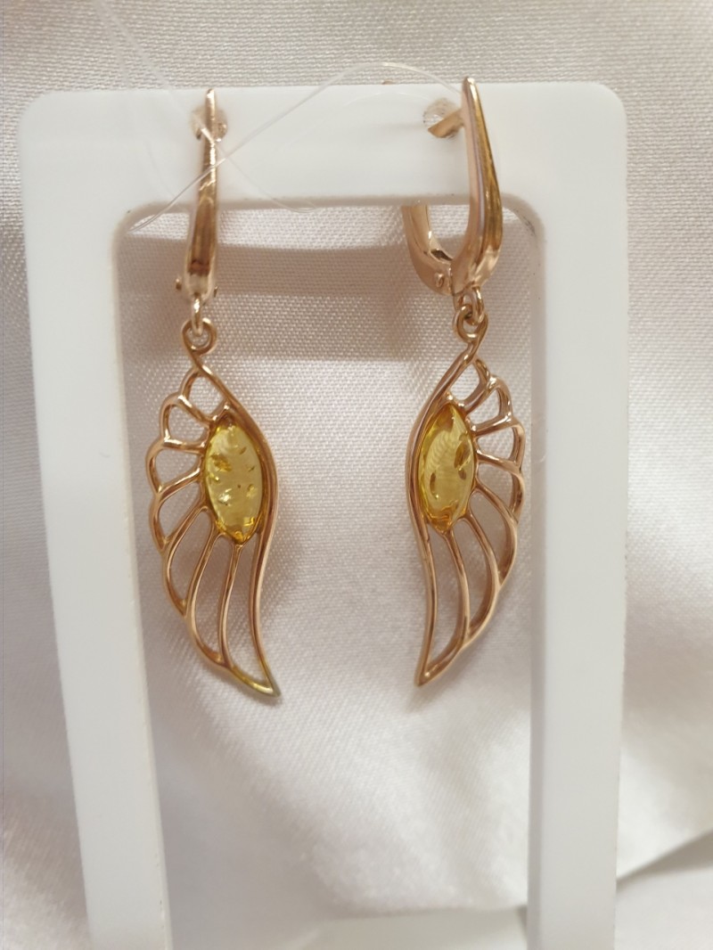 Vackra örhängen gjorda av silver 925 prov (guldpläterade), med bärnsten, fantastisk "bit av solen"! En unik möjlighet att framhäva din individualitet, att förmedla bilden av femininitet, solsken och ömhet.