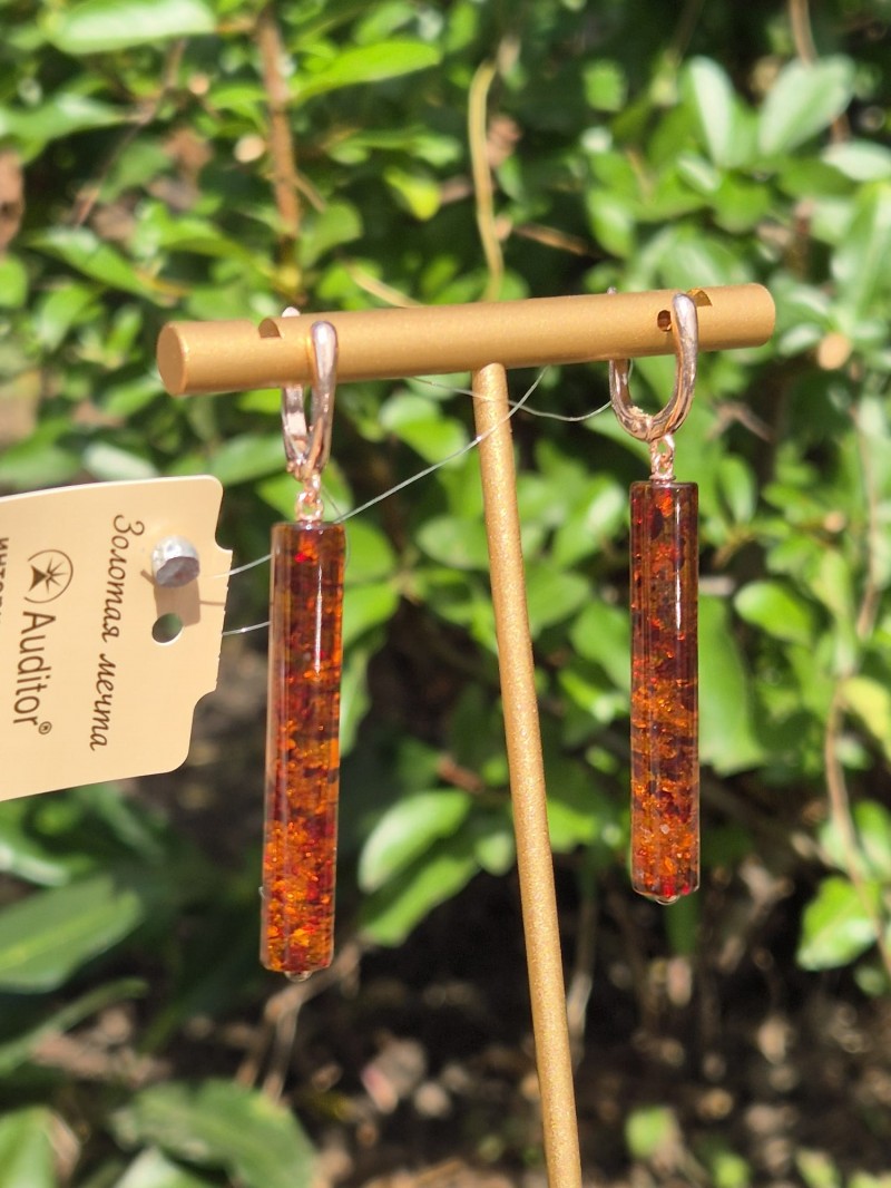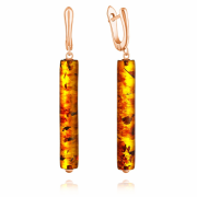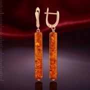 Amberörhängen som en släpvagn i röd förgyllning-en snygg och elegant smycken som understryker kvinnligheten och elegansen hos dess bärare. Den naturliga bärnsten i en långsträckt cylinderform ser filigran och ädla ut, medan den röda förgyllningen perfekt betonar sin varma glans.
