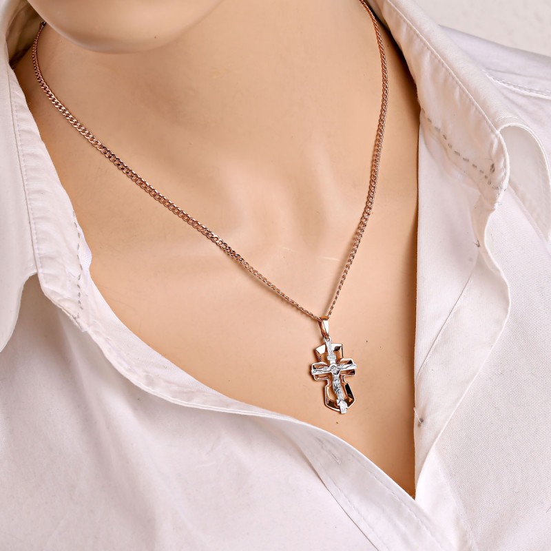 rött guld har en varm, mjuk färg som ser särskilt elegant ut på huden. I kombination med vita guldelement skapas en sofistikerad kontrast och en fin glans. Denna färgkombination betonar korsets linjer och ger smyckens djup och modernitet. Det är lämpligt för både vardagsbruk och festliga tillfällen.