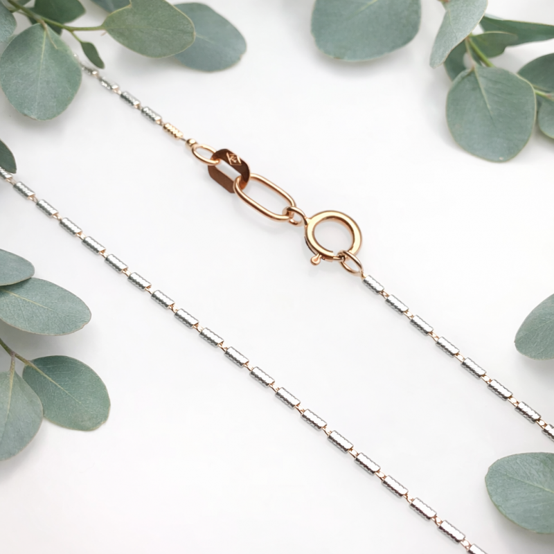 Denna fina guldkedja är mycket mer än ett smycke - det är ett kärleksfullt tecken på uppmärksamhet som följer med varje dag. Tillverkad av 585 rött guld, kombinerar den en varm guldglans med dekorativa, spiralformade element i vitt guld, som ger designen en livlig ljusreflektion och speciellt djup.