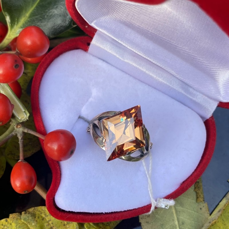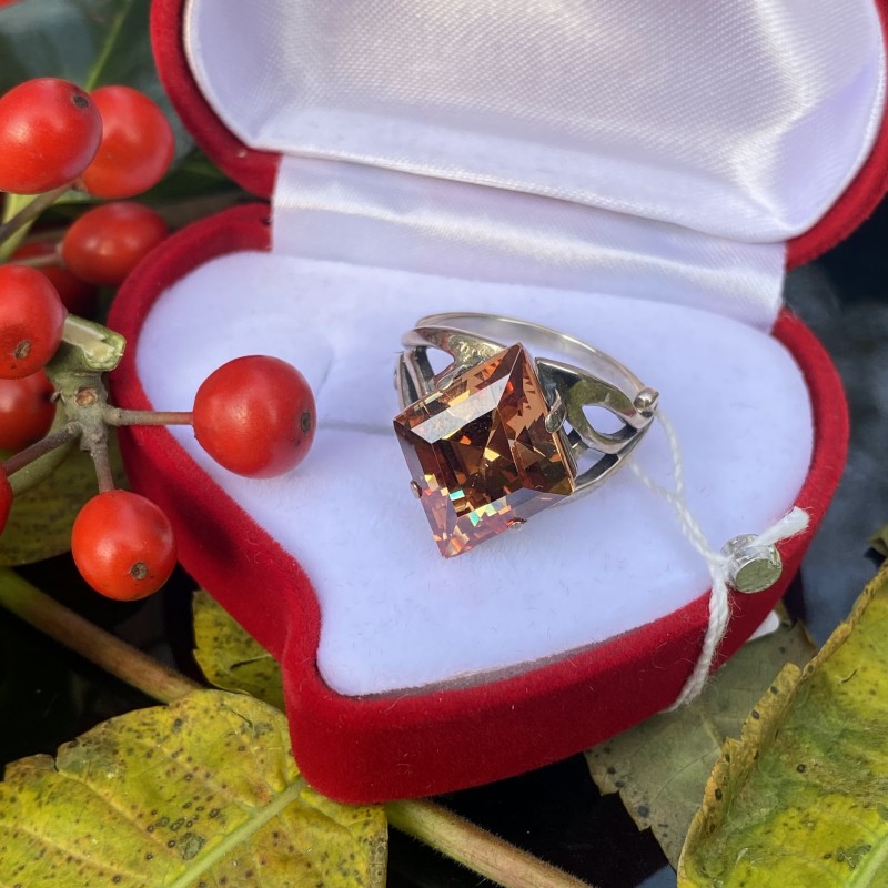 Förtjusande delikat ring med charmig och gnistrande cognacfärgad zirconia i en vacker svärtad silverram gjord av 925 silver. Denna dekoration har ett uppdrag att förmedla de ljusaste och högsta känslorna till sin ägare! Färgen på stenen innehåller enorm kraft och visar detta med aristokratisk prakt. Den verkar omsluta sin ägare i värme och distraherar henne från liv och rörelse i världen omkring henne.