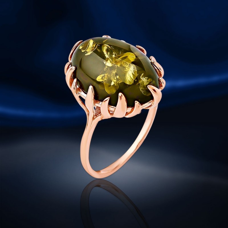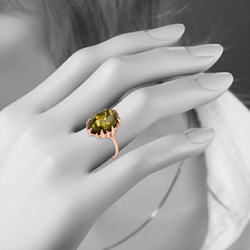 Elegant ring gjord av 925 silver, guldpläterad, dekorerad med bärnsten i gröna nyanser.