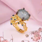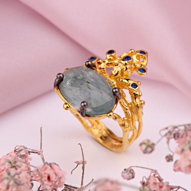 En charmig ring gjord av 925 sterling silver med solid gul guldplätering, dekorerad med vacker stor akvamarin och cubic zirconia. Tack vare skickligt placerade accenter med svärtning ser ringen unikt vacker ut. Ett utmärkt komplement till din bild av femininitet och romantik.