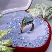 En charmig ring gjord av svärtat 925 silver med solid gul guldplätering, dekorerad med vacker stor obearbetad akvamarin. Tack vare skickligt placerade accenter med guldplätering ser ringen unikt vacker ut. Ett utmärkt komplement till din bild av femininitet och romantik.
