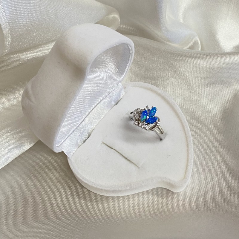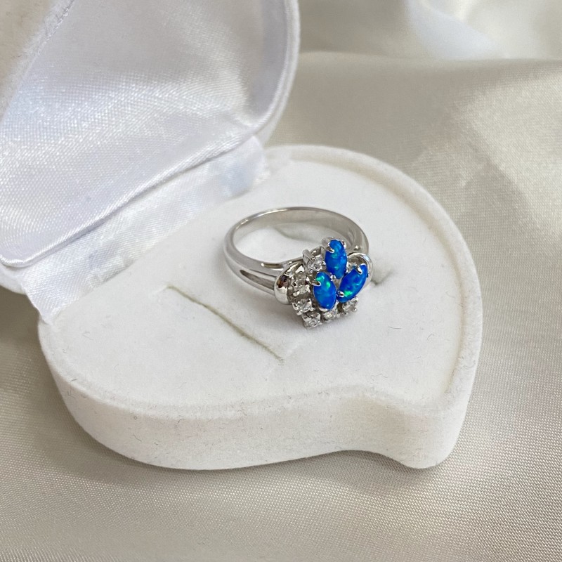 Vacker ring gjord av 925 sterling silver med förtrollande blå opal och gnistrande zirconia-insatser. En sådan ring kommer att betona förfining av smak och få dig att känna dig som en riktig drottning.