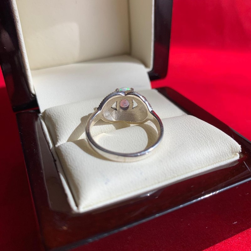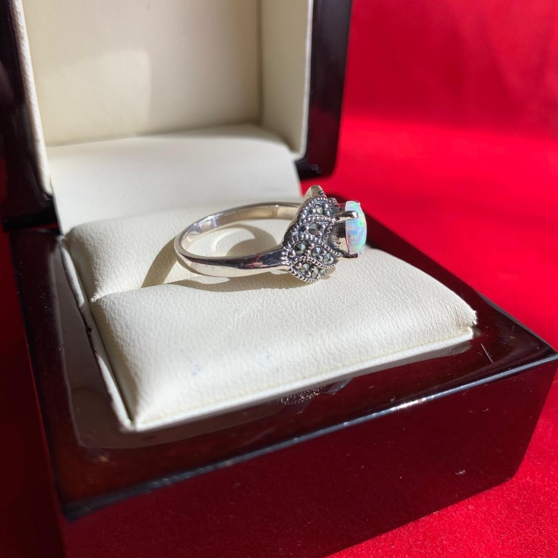 Vacker ring gjord av svärtat 925 sterling silver med förtrollande opal och djupa markasitinsatser. En sådan ring kommer att betona förfining av smak och få dig att känna dig som en riktig drottning.