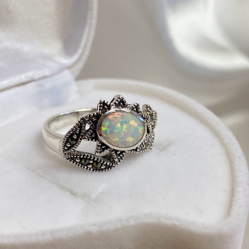 Vacker ring gjord av svärtat 925 sterling silver med förtrollande opal och djupa markasitinsatser. En sådan ring kommer att betona förfining av smak och få dig att känna dig som en riktig drottning.