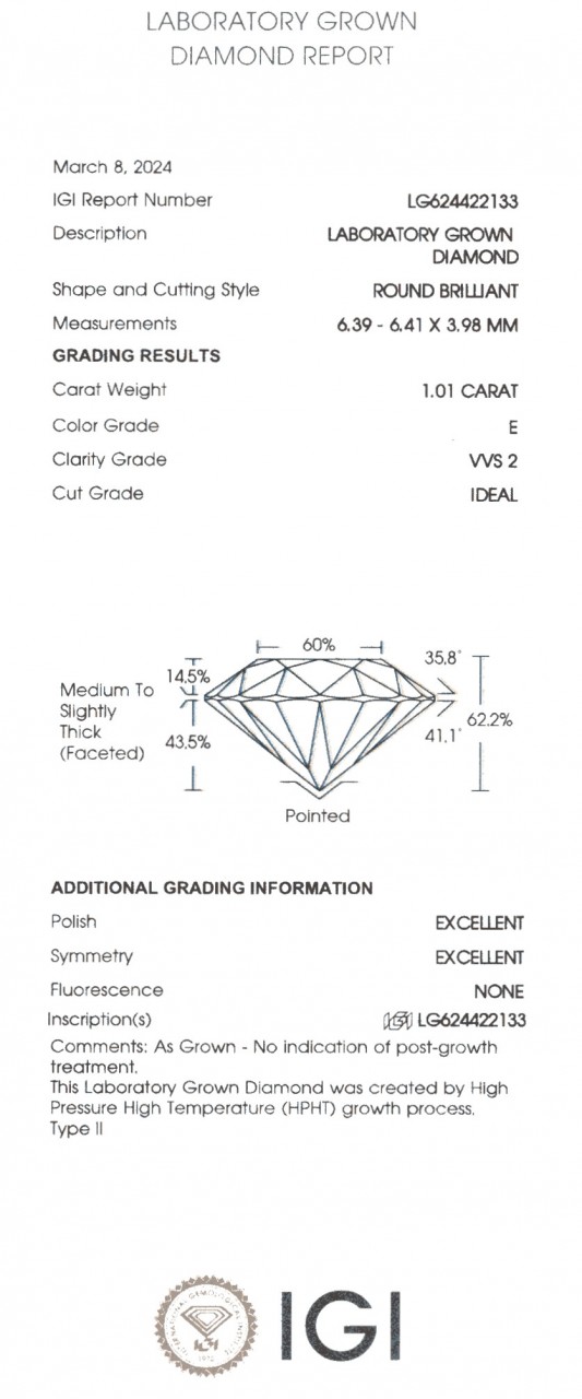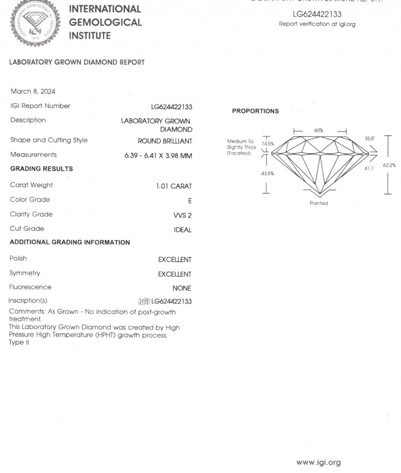 Användning: 1 Diamond 1.01 Ct. E-VVS2 IDEALE, LAB-odlade diamanter Ø 6,0 mm Laboratorierapport LG624422133