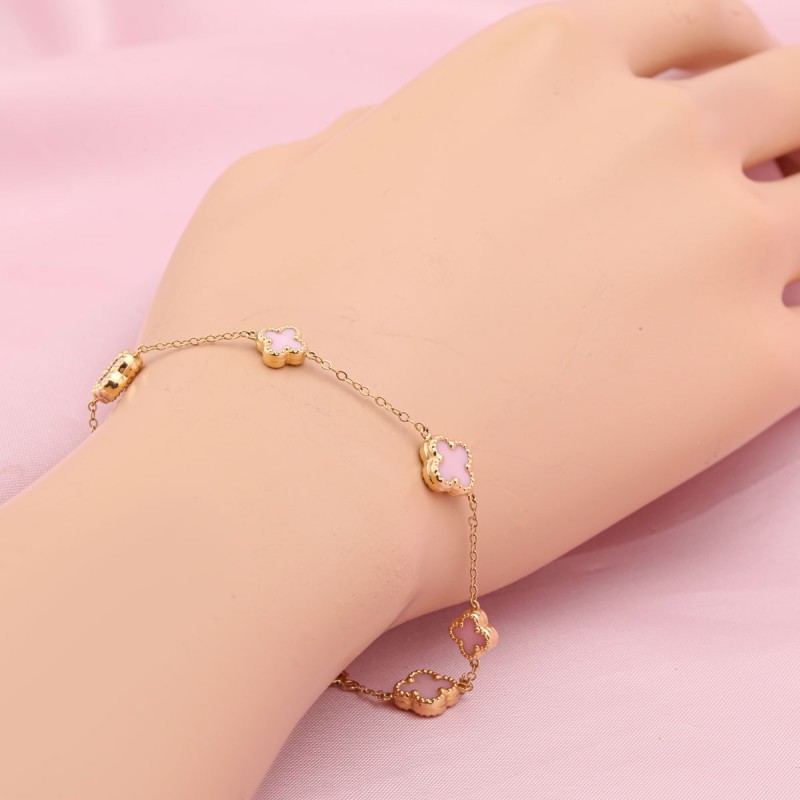 Guld armband gul guld agat. Ett armband av 585 gult guld med delikat rosa agat - ett elegant smycke som ger looken mjukhet, värme och en romantisk touch. De rosa agatinläggen är designade i form av klöverblad och omgivna av en fin dekorativ kant som ytterligare understryker deras elegans.
