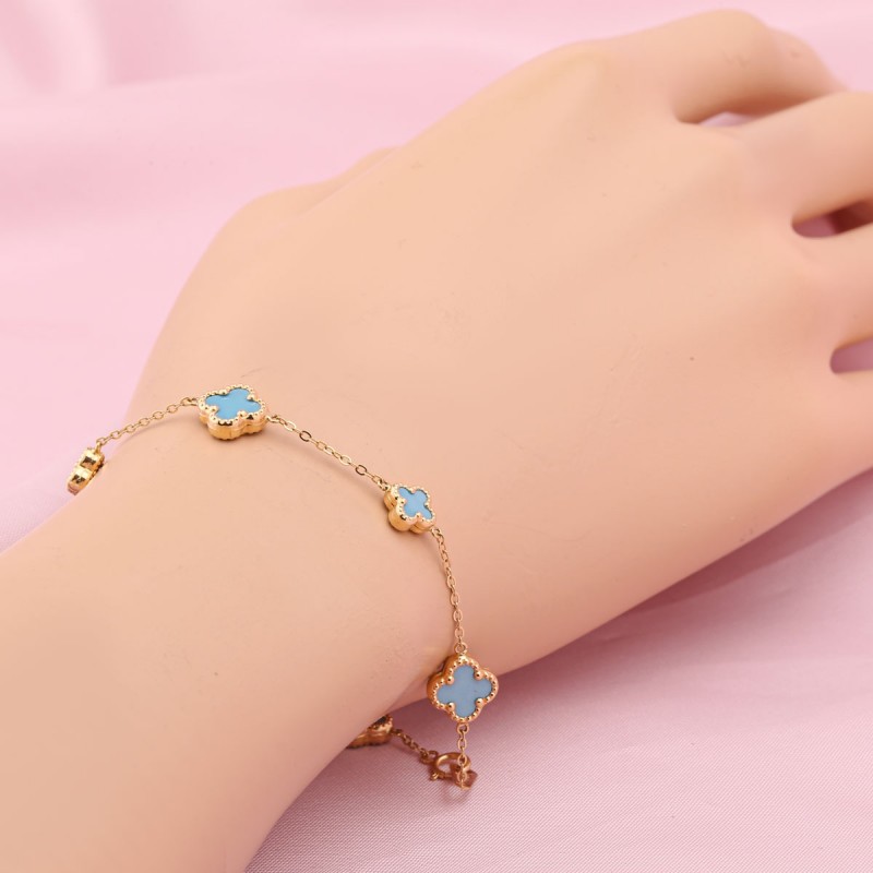 Guld armband gult guld turkos. Detta armband av 585 gult guld kombinerar lätthet, feminin elegans och en fräsch färgaccent. Delikat turkosa klöverbladselement i en klar, himmelsblå ton är arrangerade jämnt längs kedjan, vilket skapar en harmonisk balans mellan färg och glans. Den varma guldtonen framhäver det turkosa vackra och ger smycket en solig, vänlig karisma.