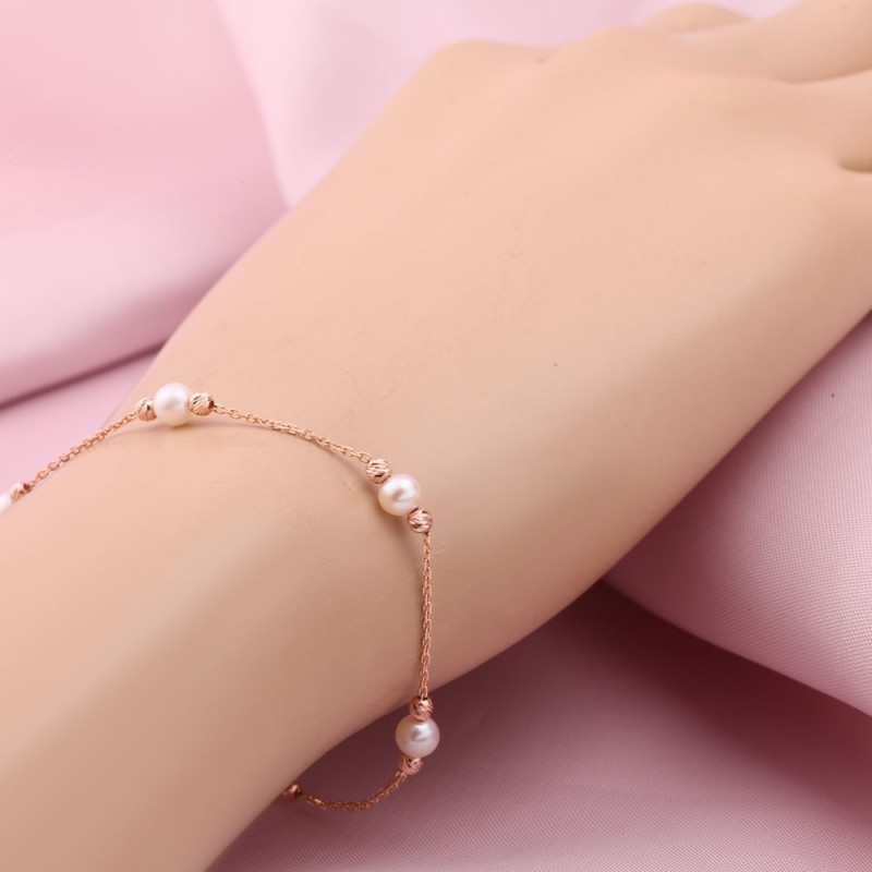 Guldarmband ryskt guld 585 i Tyskland. Delikat och romantiskt armband av 14 karat rött guld, dekorerat med guldslipade dekorativa pärlor och naturliga odlade pärlor. Kedja - ankarfläta med diamantslipad.