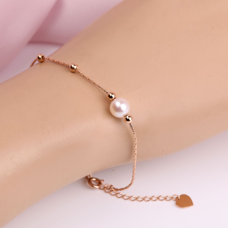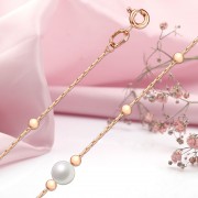 Ett charmigt, exceptionellt vackert 14k ryskt rött guldarmband dekorerat med vita pärlinsatser och guldkulor på en "rävsvans" vävd kedja. Skönhet, lyx och inget annat! Ett sådant armband kommer perfekt att dekorera handen och betona dess elegans, komplettera bilden och ge den charm, femininitet och sofistikering!