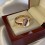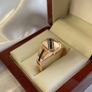 14 ayar kırmızı altından üretilmiş, ızgara tabanlı şık erkek yüzüğü. Yarısı çok parlak, yarısı mat olan üst platform, emaye ve siyah zirkonlardan oluşan dekoratif bir parça ile süslenmiştir. Yüzüğün iç kapalı yüzeyinde altın numunesinin yer aldığı damga bulunmaktadır.