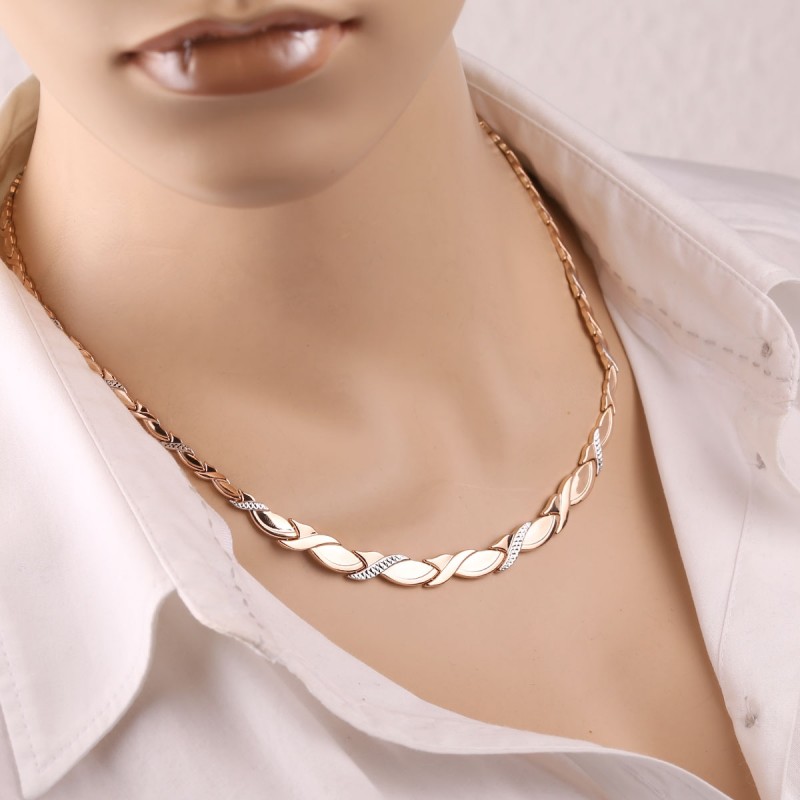 Altın Collier Rus altın 585 Bicolor. Köpüklü elmas kesimi ile 585 beyaz altın ve kırmızı altından yapılmış zarif ve hacimli altın collier. Kolyenin içi bir ayna yüzeyi ile pürüzsüzdür. Altından yapılmış Collier, resimde gerekli aksanı ayarlar ve aksesuarların zenginliğine ve lüksüne dikkat çeker, çünkü altın güzel, şık, şık ve pahalıdır. Hem sağlam bir bayana hem de genç bir kadına uyuyor.