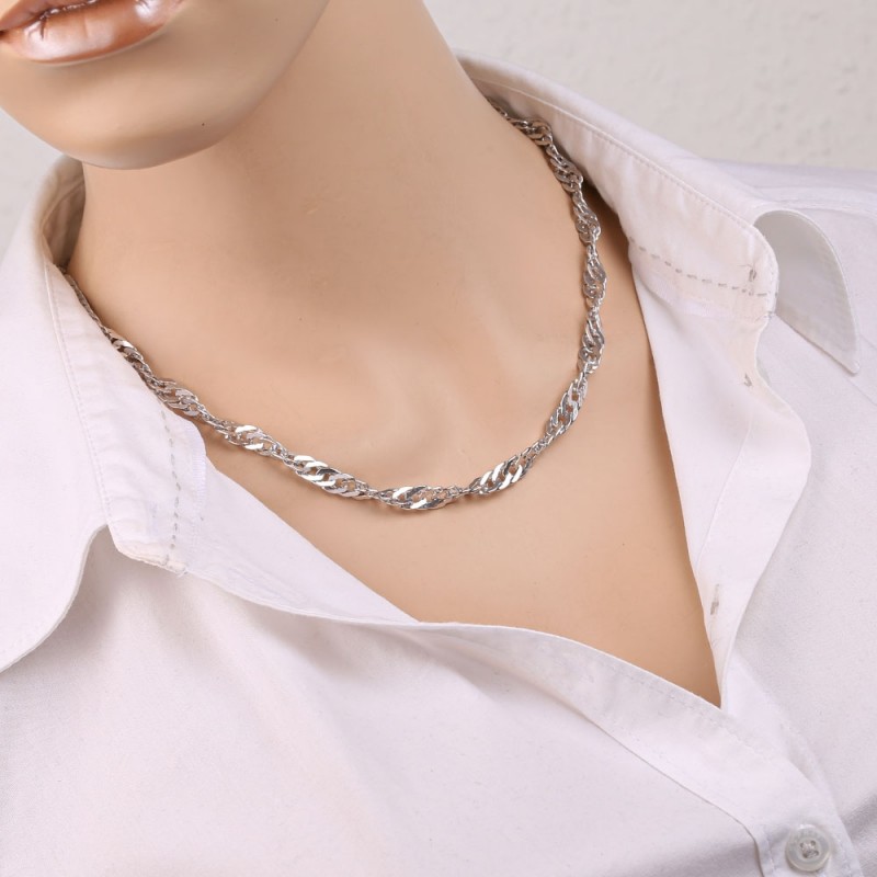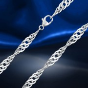 Singapur zinciri, özellikle hassas ve yüksek kaliteli işçiliğiyle etkileyici olan özel bir zincir türüdür. En ayrıntılı ve yüksek kaliteli zincir türlerinden biridir ve bu nedenle genellikle kolye ucu olmadan giyilir. Singapur zincirini bu kadar özel kılan şey, zincir bağlantılarının yakın ve karmaşık bağlantısıdır. İnce zırh bağlantıları aynı zamanda bükülmüş bir biçimde de mevcuttur; bu, bu zincir modeline ışığın kırılması nedeniyle özel bir parlaklık kazandırır. Birbirine sıkı sıkıya kenetlenen zincir elemanlarının zarif tasarımı, Singapur zincirine kadınsı karakterini veriyor ve onu kazak zinciri olarak kıyafetlerin üzerine de takılabilen bir mücevher parçası haline getiriyor.